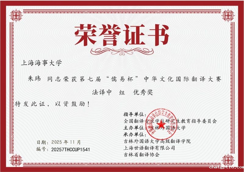 此次法语专业学生获该届赛事全国唯一的一等奖,体现了法语专业自成立以来深耕教学的成果。2025年2月,23级陈昫儒同学获第五届“海洋杯”国际翻译大赛中译法组二等奖,朱玮同学获法译中组、中译法组三等奖,琚玮琪同学获法译中组优秀奖;2025年9月,琚玮琪同学作为全国102名选手之一代表上海海事大学参加“外教社杯”第十七届全国高校法语演讲比赛。法语专业将继续坚守育人初心、深化教学改革,坚持“以赛促教、以赛促学”,不断取得新的佳绩。